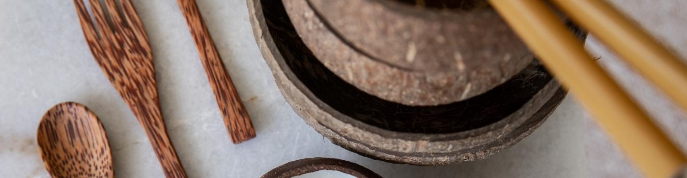 Coconut Shell Bowls + Palm Wood Forks Combo Set
